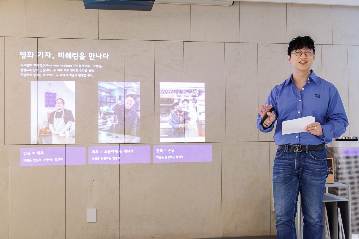 김성현 기자는 현직 영화 기자로, 미슐랭 레스토랑 세계를 영화 스크린의 미쟝센에 비유하며 북토크를 시작했는데요. 셰프는 영화감독으로, 레스토랑 매니저와 소믈리에는 영화배우, 레스토랑을 찾는 손님은 영화 관객에 비유했어요.