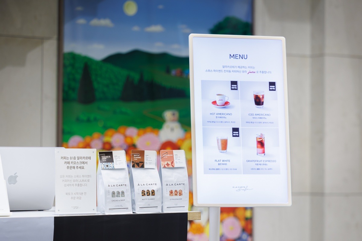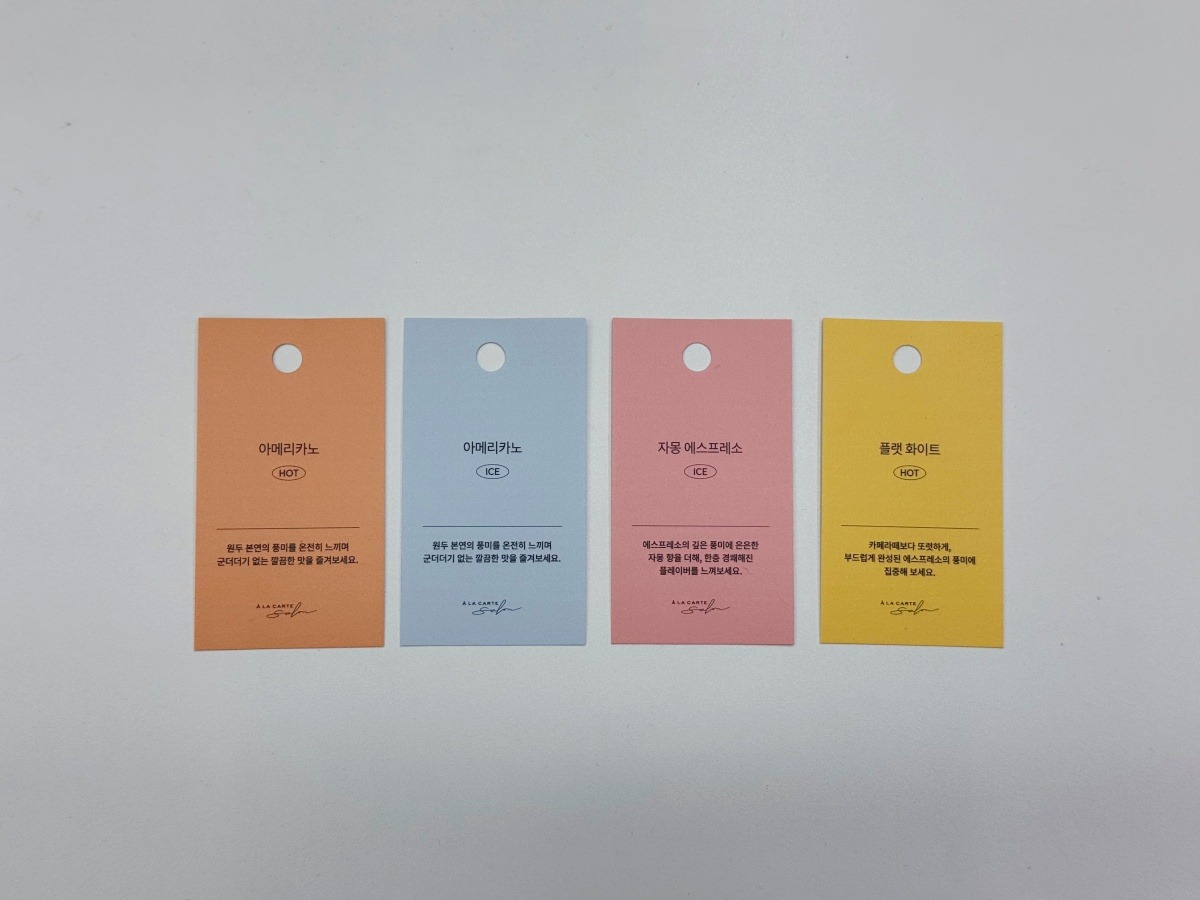 알라카르테 살롱 참석자는 카페에서 원하는 메뉴를 시음할 수 있어요. 아메리카노(핫, 아이스), 자몽 에스프레소, 플랫 화이트 네 가지 메뉴 중에 선택할 수 있습니다.