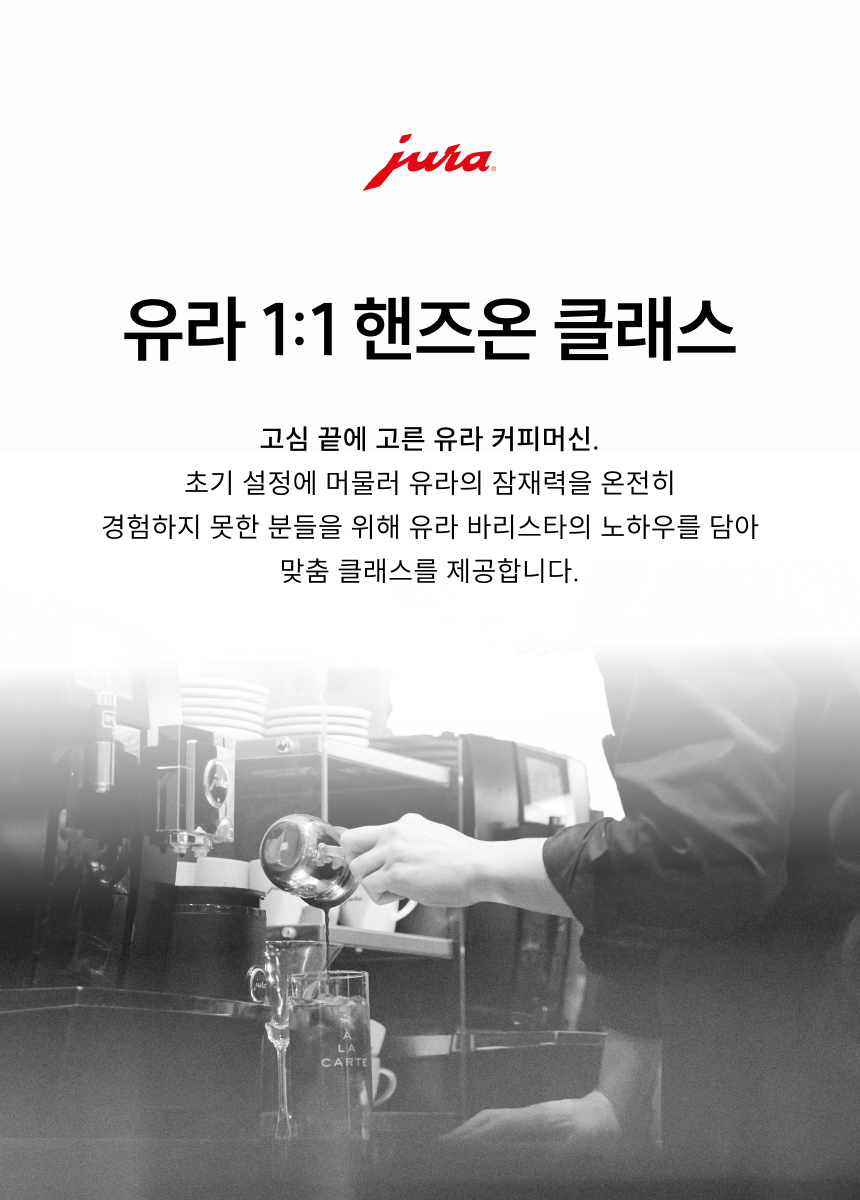 유라는 올해부터 유라 커피머신을 사용하는 고객을 대상으로 유라 바리스타의 일대일 밀착 과외를 제공하는 ‘유라 1:1 핸즈온 클래스’를 진행하고 있어요. 지난 1월부터 시범 운영 중으로, 유라 커피머신을 구입 후 알라카르테몰에서 정품 인증한 누구나 신청할 수 있는데요.