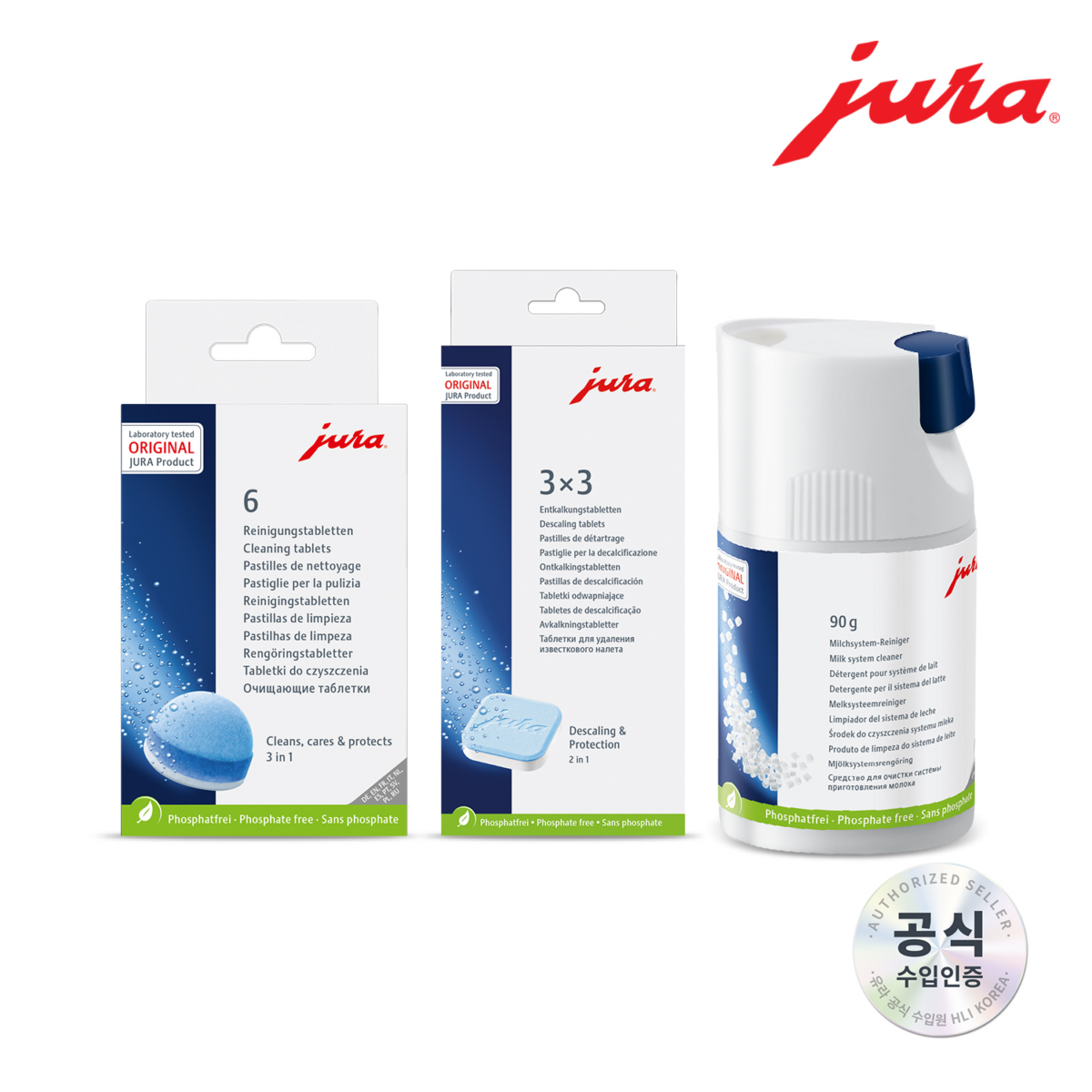 유라에는 자동 세척 시스템을 위한 ‘세척 알약’과 우유 시스템 세척을 위한 ‘우유 시스템 세척 알약’, 그리고 머신 내부 석회질을 제거하는 ‘물때 제거제’가 있어요. 이 세정제는 모든 유라 커피머신에 사용할 수 있는데요.