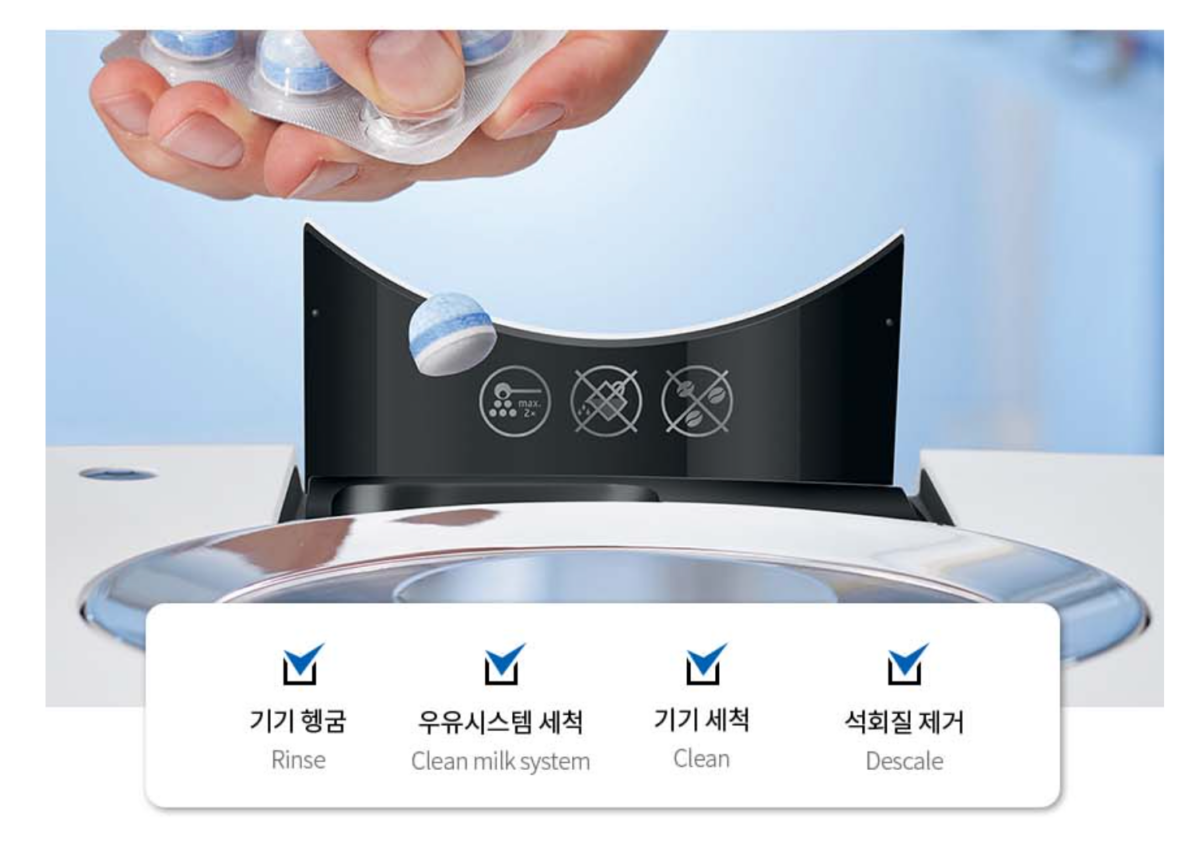 (김승완) 유라 커피머신은 켜진 상태에서 자동 헹굼을 약 80회 진행했거나 커피를 약 180회 추출했을 때 커피머신을 세척하라고 알려주는데요. 이때 머신의 안내에 따라 자동 세척 시스템을 진행하면 됩니다. 머신을 세척할 때는 유라의 세척 알약과 빈컵을 준비하는 것이 좋고요. 전체 세척은 약 20분 걸립니다.